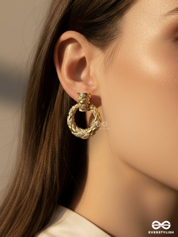 TWISTED GLOW- 18K GOLD PLATED ANTI-TARNISH GOLDEN TEXTURED LUXURY EARRINGS INLAID WITH CUBIC ZICRONIA STONES